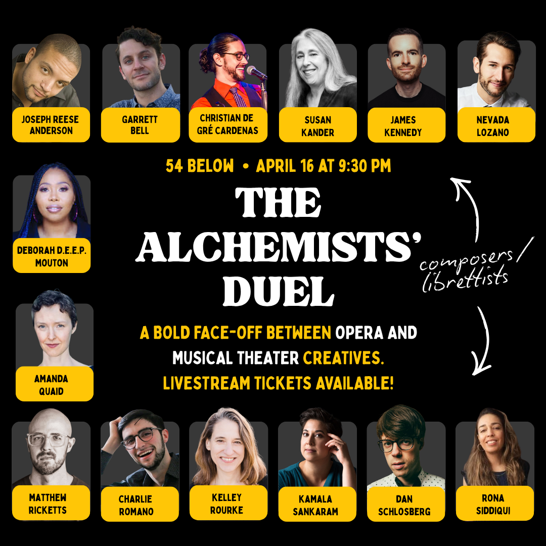 Five pairs of award-winning composer/librettist teams enter the ring to conjure brand-new works sparked by freshly commissioned ideas, each fighting for glory, bragging rights, and a $5,000 prize to be donated to the charity, nonprofit, or project of their choosing.